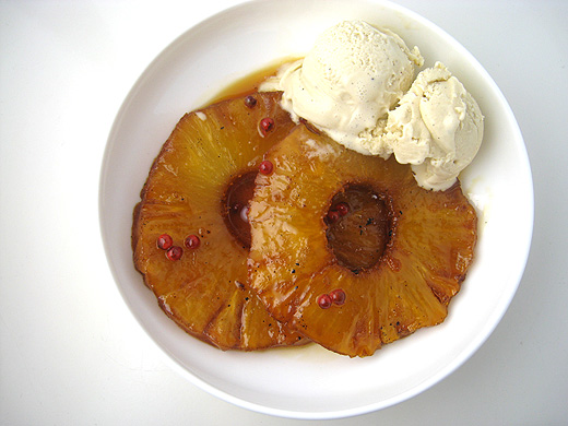 I love dessert recipes that get you thinking about familiar ingredients in new ways . Claudia Fleming recommends transforming slices of fresh pineapple by roasting them in caramel sauce infused with vanilla bean, bay leaf and pink peppercorns. The finished dessert is incredibly complicated and rich. The sweetness of the caramelized pineapple is countered with the spice of a few pink peppercorns. I followed her suggestion and served the pineapple with some black pepper ice cream to smooth out the finish of the plate.